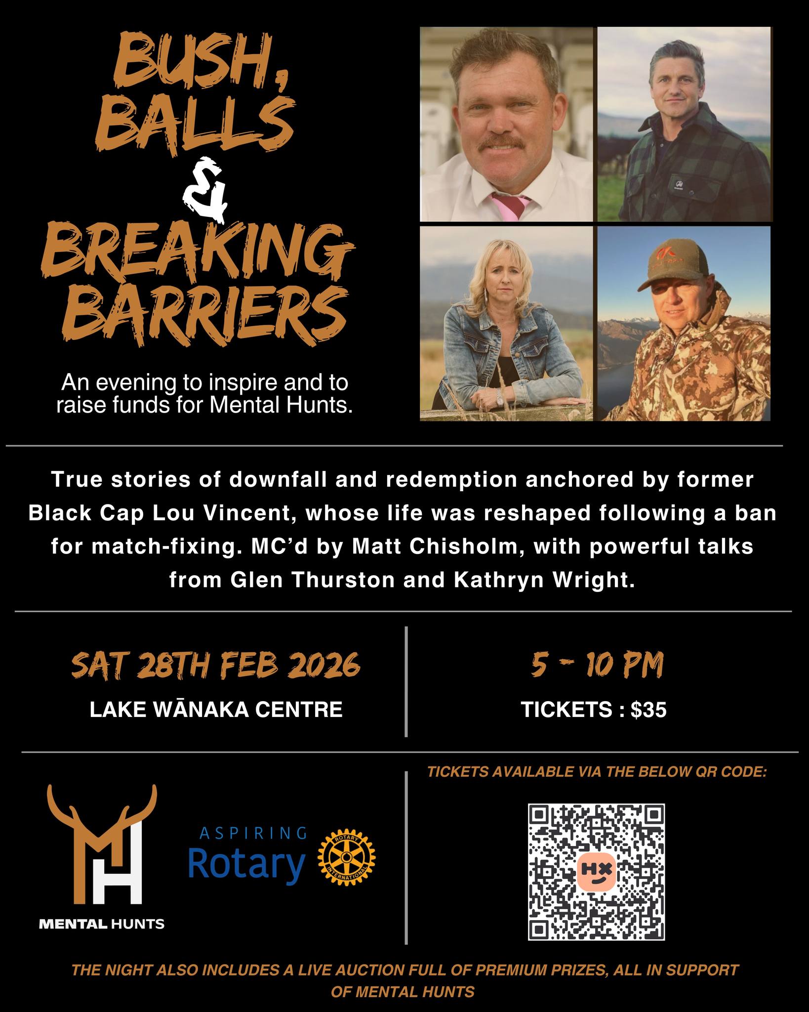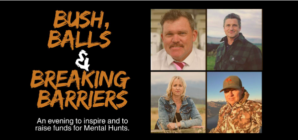 Aspiring Rotary is putting on Bush, Balls & Breaking Barriers, a good, honest evening to yarn, listen, and support Mental Hunts , who are doing awesome work for mental wellbeing in our rural community.