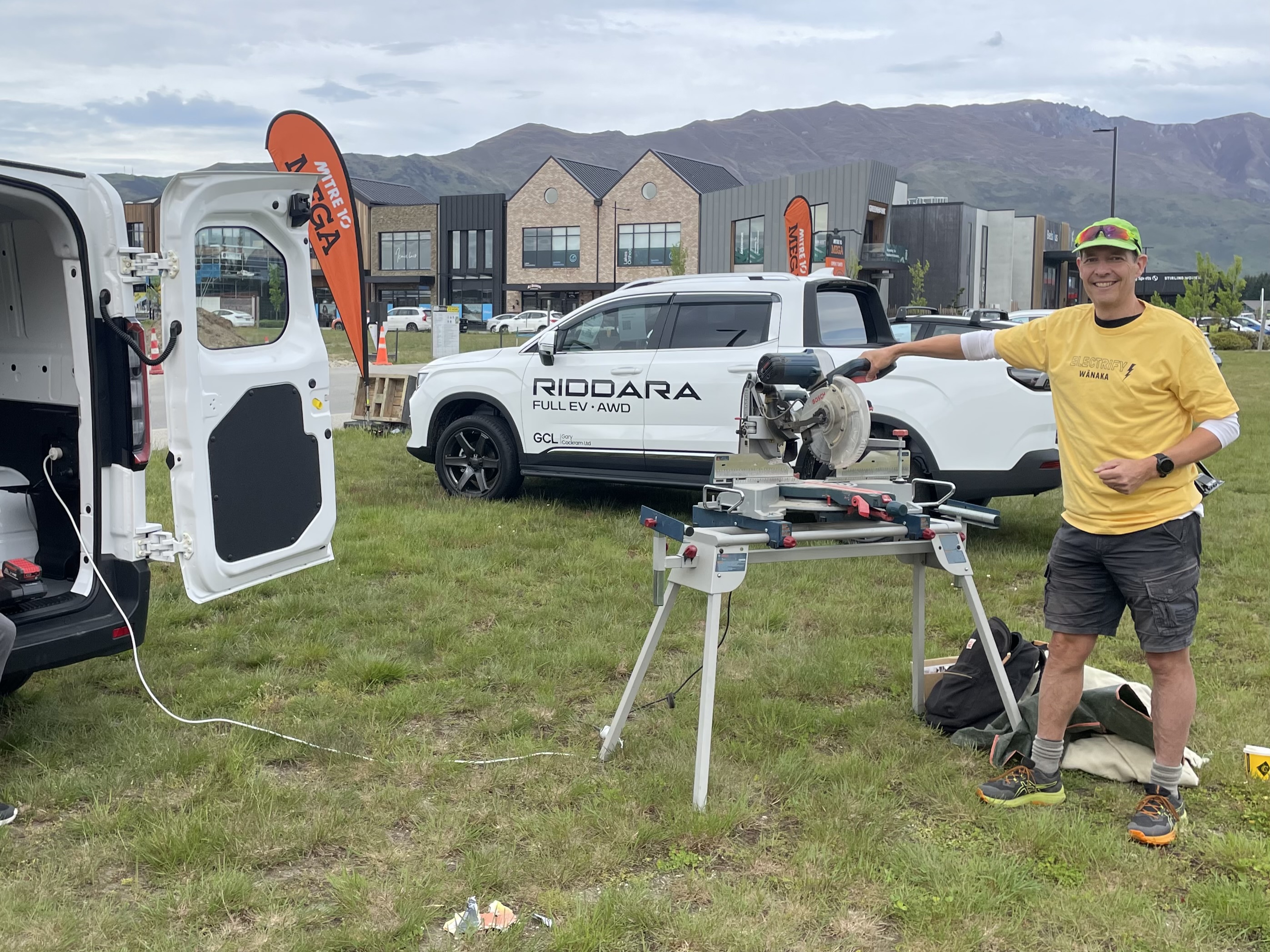 Electrify Wānaka co-founder Jonathan Holmes using a dropsaw powered by an electric vehicle at a recent Mitre 10 MEGA display.A talk in Wānaka is offering homeowners guidance on moving away from gas following news that New Zealand’s natural gas supplies are projected to run out this year.