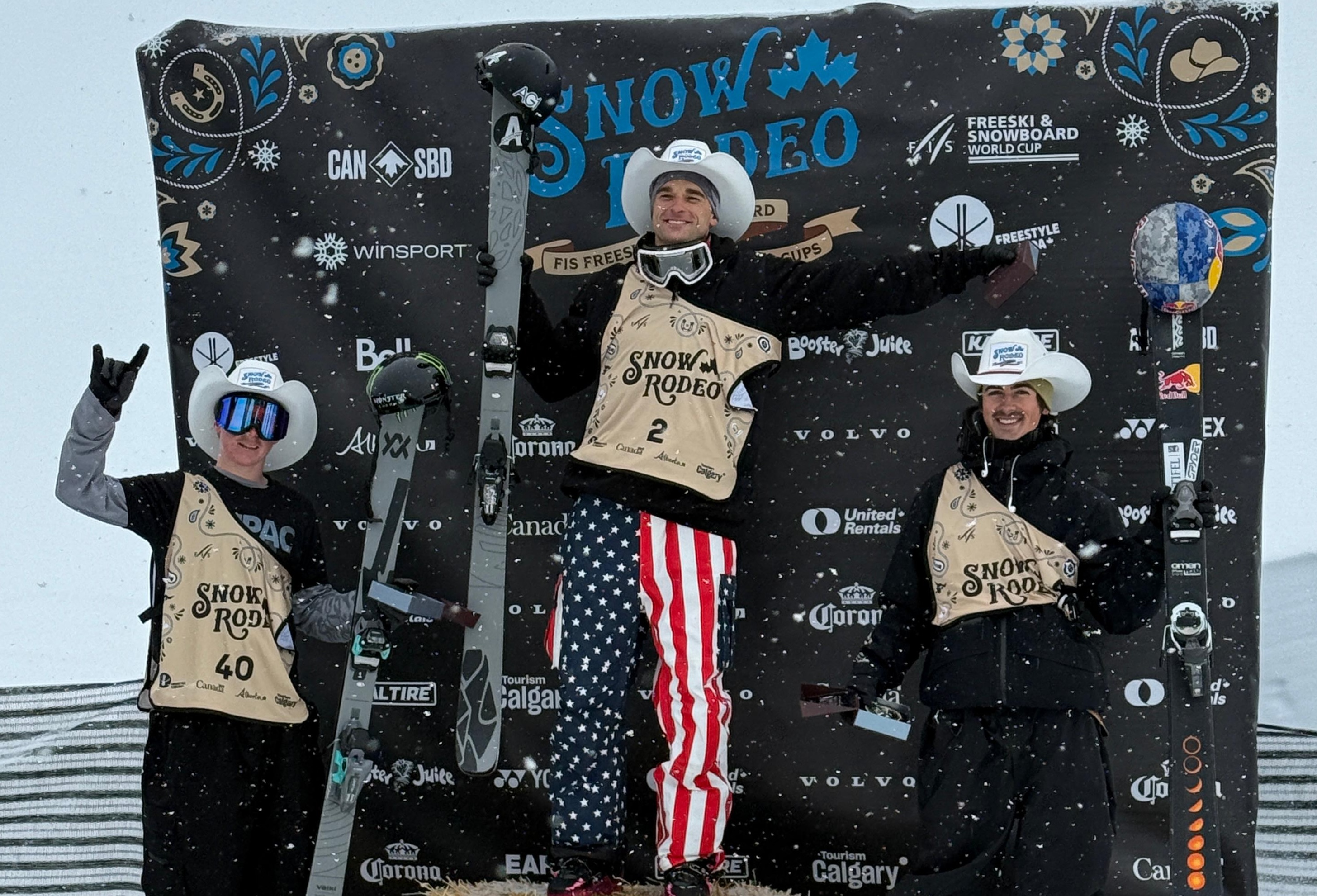 Calgary Men’s Freeski Halfpipe World Cup podium. [L-R] Finley Melville Ives NZL (2nd), Nick Goepper USA (1st), Birk Irving USA (3rd). PHOTO: Snow Sports NZ.