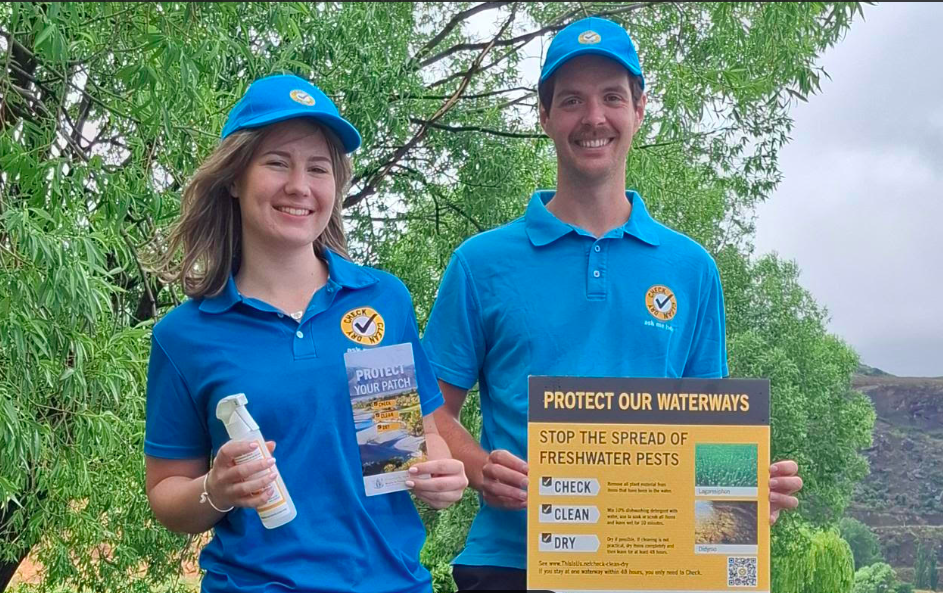 Ambassadors Zoe Eckhoff and George McLellan will be based out of ORC’s Cromwell office until mid-February, connecting with locals and visitors about how to protect the waterways from freshwater pests.