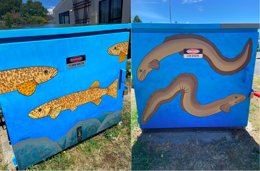 The newly painted McDougall Street powerbox features local aquatic species, including longfin eel, mayfly, stonefly, and kōaro.A new collaboration between WAI Wānaka and Chrissy Wickes is designed to “make the invisible visible”.