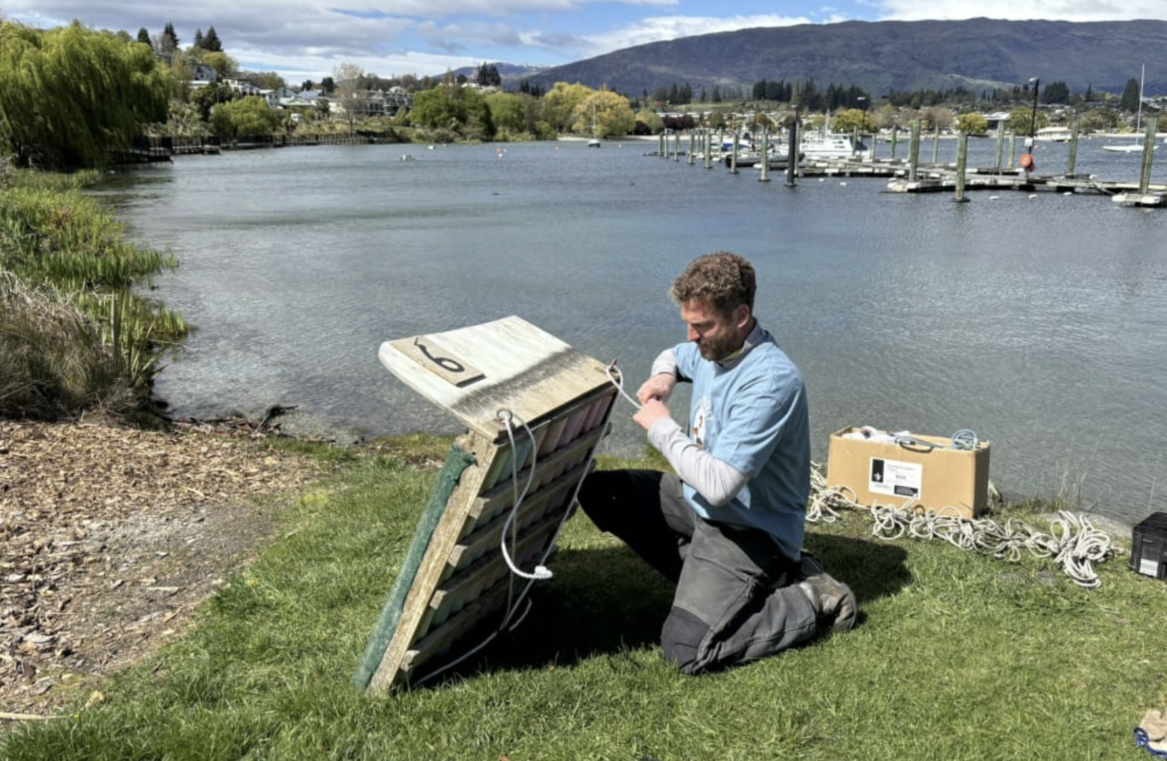 On the shore of Lake Wānaka, Markus Hermanns is busy checking and repairing nesting platforms ahead of the pūteketeke breeding season.